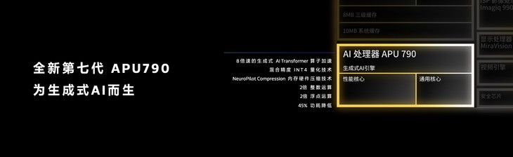 APU 790内置了硬件级的生成式AI引擎,可实现更加高速且安全的边缘AI计算,深度适配Transformer模型进行算子加速,处理速度是上一代的8倍,1秒内可生成图片。