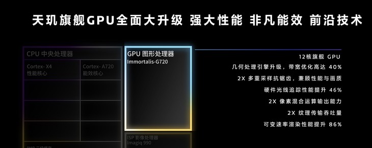 GPU方面,天玑9300率先采用新一代旗舰12核GPU Immortalis-G720,与上一代相比,峰值性能提升46%,相同性能下功耗节省40%,带来持久流畅的旗舰移动游戏体验。