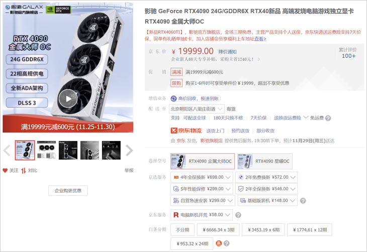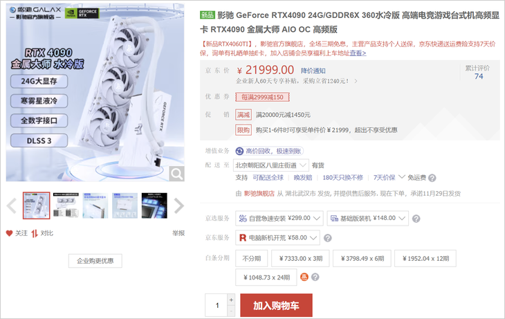 以京东商城为例,在影驰旗舰,影驰RTX4090金属大师AIO OC水冷版显卡目前参考价格为21999元。