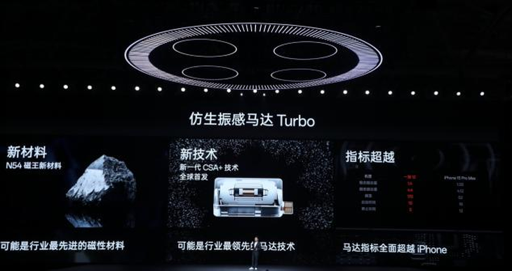 一加 12 全球首发与瑞声科技联合研发的仿生振感马达 Turbo。这颗仿生振感马达 Turbo 使用行业先进的稀土磁性材料 N54 SH 磁钢,配合全球首发的行业领先的第五代磁路技术 CSA+,在振动量、频宽、响应速度、振动丰富度等多维度全面超越 iPhone,为消费者带来了有生命力、符合直觉、不打扰的振感体验,马达体验再领先行业 1 年。