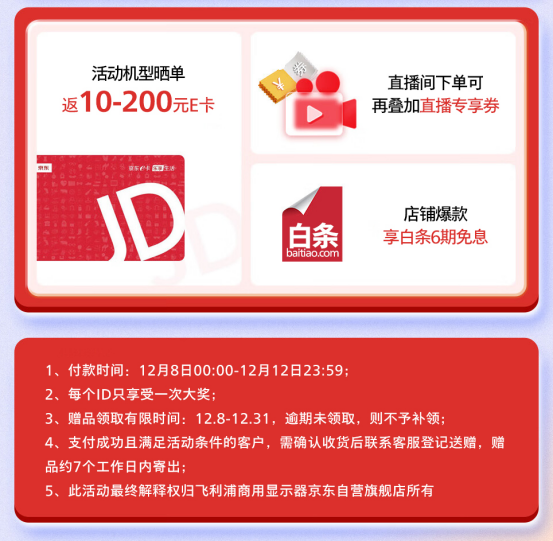 活动期间,爆款机型优惠直降,部分机型可享白条6免息,限时限量购买指定机型即享惊喜优惠,直播间下单更优惠,部分机型好评晒单还可返20-100元E卡!