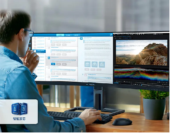 45B1U6900C拥有45英寸32:9超宽比例大屏,相当于两台16:9的显示器无缝拼接,1500R大曲度让视野更贴合人眼弧度,创作更加专注。5120 x 1440 DQHD超清分辨率,配合“8bit高色深+100%sRGB广色域+Delta E<2高色准+VESA DisplayHDR 400技术认证”的参数组合,进一步适配2K/4K影音视频剪辑画质,展现出更具有立体感和层次感的质感画面。同时配备了100W的Type-C满血接口与RJ45千兆网口,轻松解决笔记本电脑等移动设备的数据传输和有线网连接问题。
