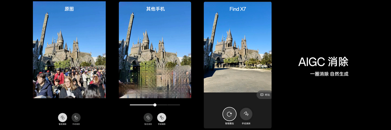 得益于全新的大模型能力,Find X7 带来全新的 AIGC 消除功能。相比同平台其他模型只能支持人体的识别,Find X7 不仅支持超过120类主体的识别与分割,还可以实现发丝级的分割、高达6个的多主体分离,以及超大面积图像的填充与自然生成,极大地拓展了生成式视觉大模型的使用范围与实用性,让用户可以体验到全新一代的图像编辑体验。