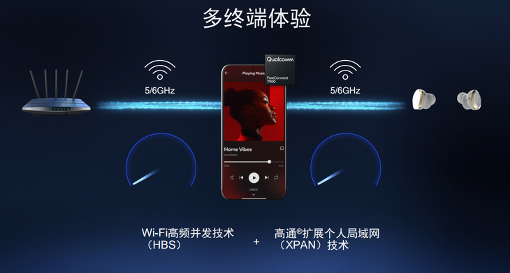 通过高通独有的两大技术——Wi-Fi高频并发技术(HBS)以及高通扩展个人局域网(XPAN)技术,FastConnect 7900能够带来更出色的体验。例如,通过Wi-Fi或蓝牙将手机和耳机连接,可以扩大其覆盖范围,实现音频流传输的全屋覆盖。