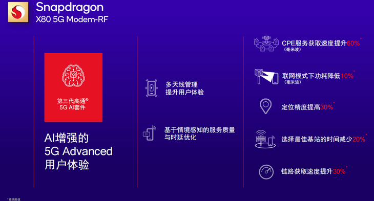 在此基础上,骁龙X80搭载了第三代5G AI套件,具备更强大的AI能力,实现进一步优化覆盖范围和定位精度,例如骁龙X80连接毫米波网络时,功耗可降低10%,定位精度提升30%。