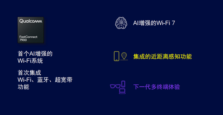 骁龙X80改善了设备的5G网络连接能力,FastConnect 7900则是提升设备的Wi-Fi体验,FastConnect 7900也是全球首个AI增强的Wi-Fi系统。