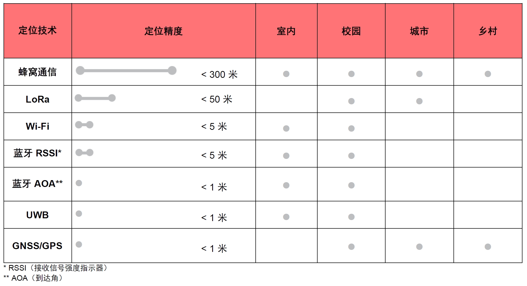 通信和定位技术的世界浩瀚无垠。在这个领域,根据适用于室内还是室外环境,每一种技术都有特定的应用场景。在户外场景中,环境的拥塞程度非常重要,您需要考虑设备的工作环境是空旷的田野,还是繁忙拥挤的城市中心。上图为您展示了不同定位技术选项的精度及其工作环境。