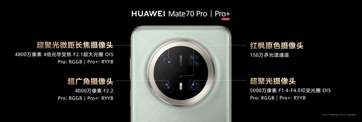 在具备精准的色彩捕捉能力的红枫原色摄像头的同时,华为Mate70系列还配备了超聚光主摄,并且支持F1.4-F40可变光圈,带来更大的感光面积。华为Mate70 Pro+更是采用了RYYB超感光传感器,带来超大主摄进光量,更大的进光量可以确保即使在暗光环境下也可以带来更清晰的图像。