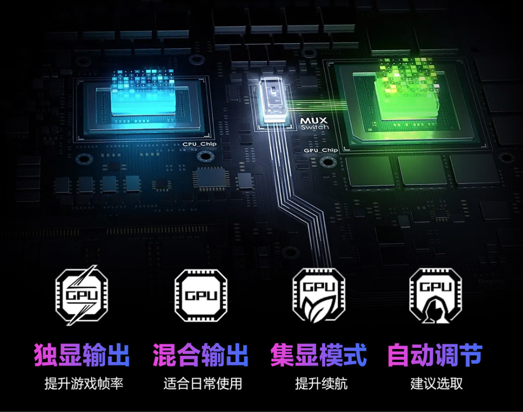 ROG枪神9超竞版还支持双显三模热切换,可以在独显、集显、混合模式三种任意切换,还可以选择自动调节,自动调整设备性能,满足用户的多样化需求。