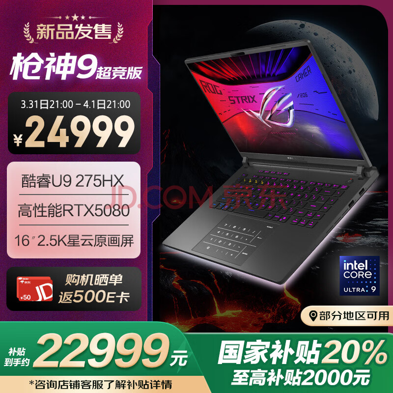 目前ROG枪神9超竞版正在预约中,预约价24999元,同时享受国家补贴,补贴到手价约22999元,购机晒单还可以获赠500元E卡,更加优惠,想要入手的用户不要错过。