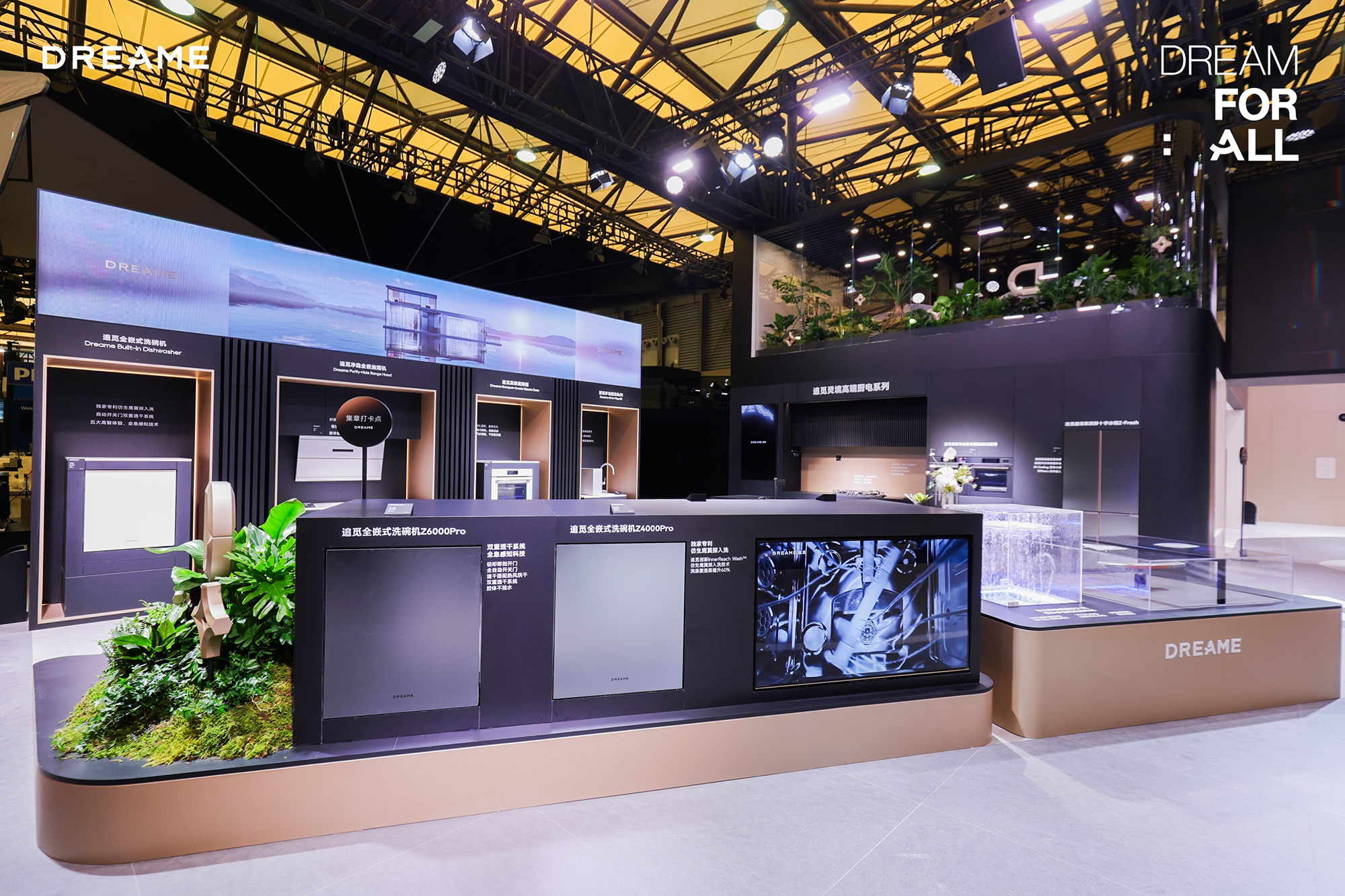 厨电展示区同样亮点十足。追觅洗碗机采用了专利仿生鹰翼探入洗技术,随着清洗过程中水温的不断变化,可变形喷淋臂的喷淋角度也会相应调整,同时结合浊度传感器,使得洗碗过程像扫地机器人一样逐层冲刷碗筷,确保清洗既细致又彻底。追觅的油烟机设计,完美体现了性能与空间的平衡,解决了传统油烟机“强吸必增噪”的问题,Z8000Pro型号的油烟机机身厚度仅为800px,比行业平均薄125px,同时搭载了贝壳纹仿生流体降噪技术,在30m³/分钟风量、1200Pa的风压下,产品运行噪音仅53db。