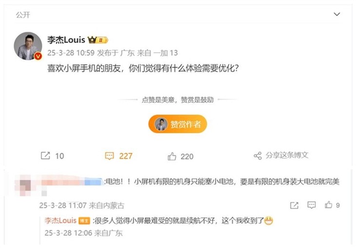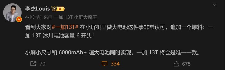 一加中国区总裁李杰在微博透露一加13T小屏和超大电池可兼得