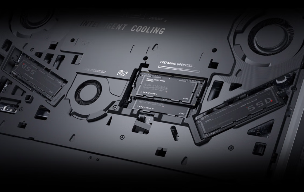 ROG枪神9超竞版配备双通道16GB+16GB DDR5 5600MHz内存,以及1TB PCIe 4.0 SSD,通过免工具快拆设计,用户可以非常方便的自行对存储以及内存进行更换升级,降低了电脑升级内存硬盘的门槛,小白玩家也能轻松上手操作。