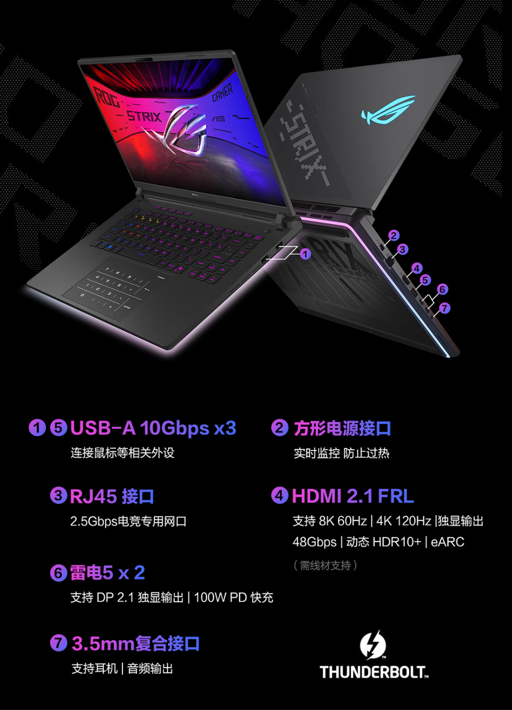 ROG枪神9超竞版提供有丰富接口,包括双USB Type-C雷电5接口,支持DP 2.1独显输出和PD充电、三个USB-A 10Gbps接口、HDMI 2.1 FRL接口、3.5mm耳机接口以及RJ45接口等,非常的全面,扩展能力出色。