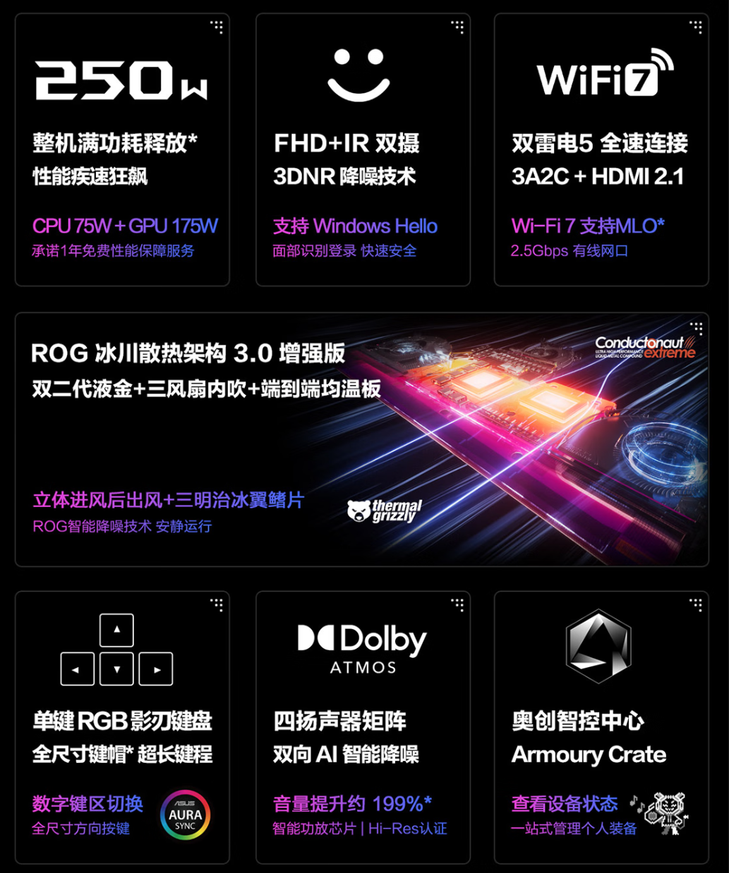 此外,ROG枪神9超竞版还支持杜比全景声音效并内置4扬声器,拥有90Wh大容量电池,支持100W PD快充,支持WiFi7等特性,具备综合全能的旗舰体验。