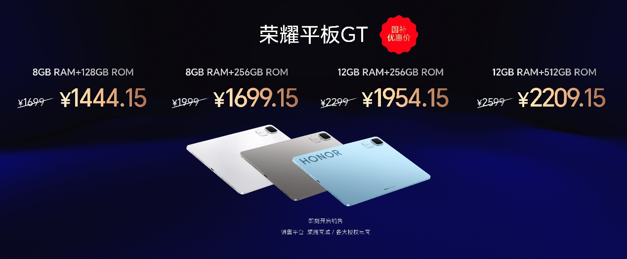 价格方面,荣耀平板GT于4月23日开启销售,有8GB +128GB、8GB +256GB、12GB +256GB、12GB+512GB等不同配置,售价1699元起,国补后最低仅需1444.15元,可通过荣耀商城、京东商城、天猫商城及各大授权电商选购。