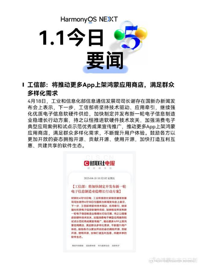 在2025年4月18日国务院新闻办公室举行的经济数据例行新闻发布会上,工业和信息化部信息通信发展司司长谢存明确表示,要推动更多APP上架鸿蒙应用商店,鼓励各方拥抱开源,加快打造互利互惠、共建共享的软件生态。这一表态不仅彰显了国家层面对鸿蒙生态建设的支持,更是对生态伙伴和开发者加入鸿蒙生态建设的有力推动 。