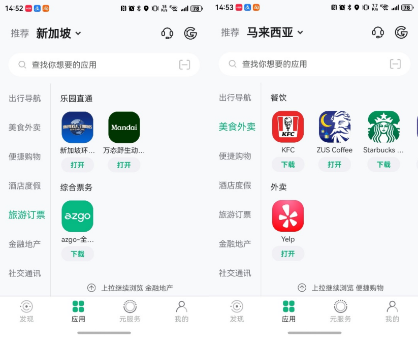 比如你去新加坡,就可以使用当地软件foodpanda和Deliveroo来查找当地美食。来到马来西亚,可以用当地的ZUS Coffee来一杯特色拿铁,这些你之前从未使用过的APP都可以在出境易上找到,让你在海外旅游时也可以和国内一样方便。