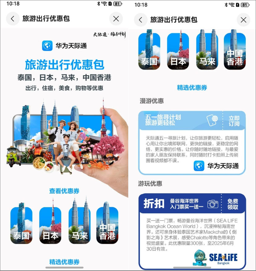 2025年4月10日至5月31日期间,点击华为天际通权益包活动页领取马来西亚、泰国、香港、日本专属酒店、商场、主题乐园、餐饮等本地权益,领取后前往对应目的地出游即可享受专属折扣。