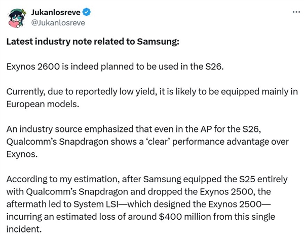 行业分析师指出,三星此次激进的技术投放策略暗含多重考量:通过区域限定策略规避初期良率风险,借助欧洲市场对技术创新的较高接受度试水,同时为后续全球推广积累数据。这种谨慎的推进节奏与台积电形成鲜明对比——后者虽掌握多数2nm订单,但量产计划更为保守。随着Exynos 2600在Galaxy S26上的实际应用,移动芯片行业正式迈入2nm时代,这场制程微缩竞赛的最终胜负,或将取决于三星能否在产能爬坡中兑现技术承诺。