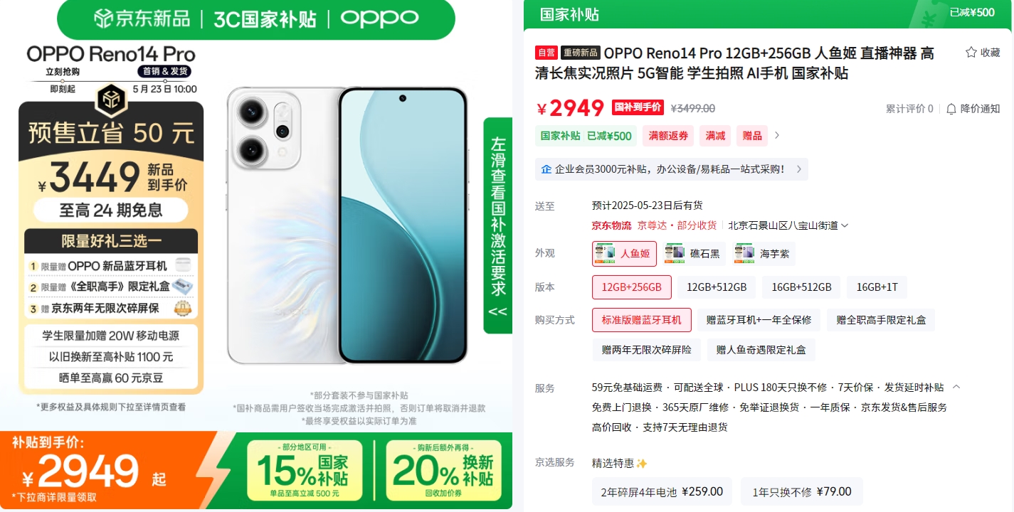 目前,OPPO Reno14 Pro 已经正式开启预约,大家可以通过官方网站、各大电商平台以及线下门店进行预订。而且手机在配置和价格方面也为我们提供了丰富的选择:12GB+256GB:定价3499元,国补后2999元;12GB+512GB:定价3799元,国补后3299元;16GB+512GB:定价3999元,国补后3499元;16GB+1TB(人鱼姬/礁石黑):定价4499元,国补后3999元。此外,预约期间,OPPO还推出了多项优惠活动,包括限量赠OPPO新款蓝牙耳机等,可以让大家在购机时享受更多福利。