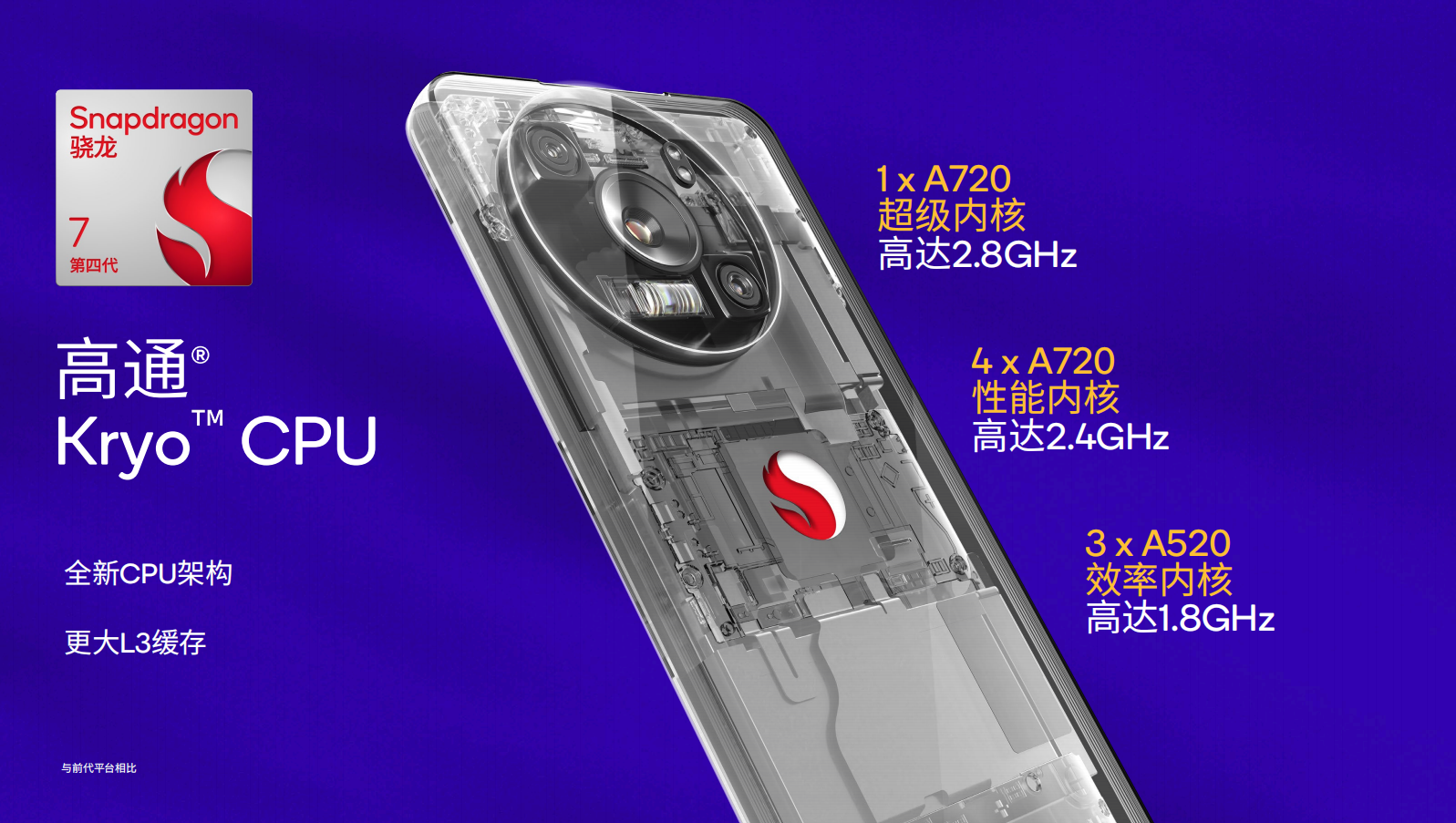 第四代骁龙7移动平台采用先进4纳米台积电工艺制程,由多个协同工作的IP模块构成,实现出色能效。其CPU架构升级为1+4+3,最高主频达2.8GHz,相比第三代骁龙7,性能提升27%,领先竞品。