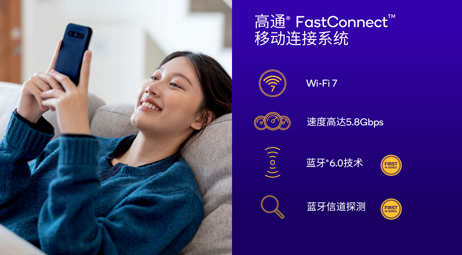 连接性能上,骁龙5G调制解调器及射频系统支持 3GPP Release 17 5G,峰值下行速率 4.2Gbps ,支持全球双卡双通,集成NB-NTN卫星通信用于紧急定位。高通智能网络选择3.0可在复杂网络环境下智能选网,FastConnect移动连接系统提供Wi-Fi 7与蓝牙6.0技术,还新增蓝牙信道探测特性,便于定位丢失物品。并且,它支持Snapdragon Seamless,实现兼容终端间快速切换。