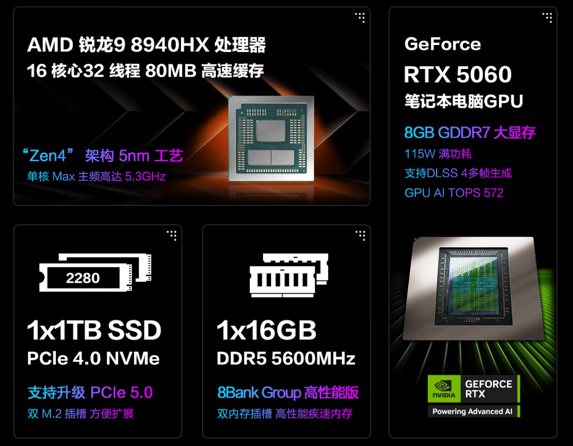 ROG魔霸新锐2025锐龙版搭载AMD锐龙9 8940HX采用Zen4架构5nm工艺,拥有16核心32线程,单核MAX主频达到了5.3GHz,并且配备了80MB高速缓存,性能表现出色,无论是游戏还是内容创作,都可以保证高负载多任务的流畅运行。
