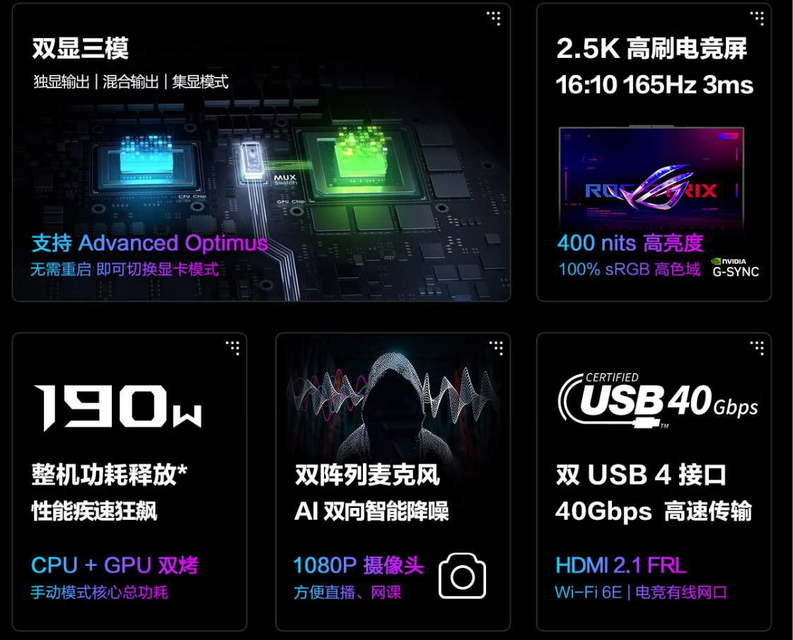 ROG魔霸新锐2025锐龙版还支持ROG BOOST超频引擎,可以实现GPU的自动超频,带来性能突破。同时,魔霸新锐锐龙版还支持双显三模热切换,无需重启电脑就可以完成图形输出模式的切换,满足更多场景下的电脑使用需求。