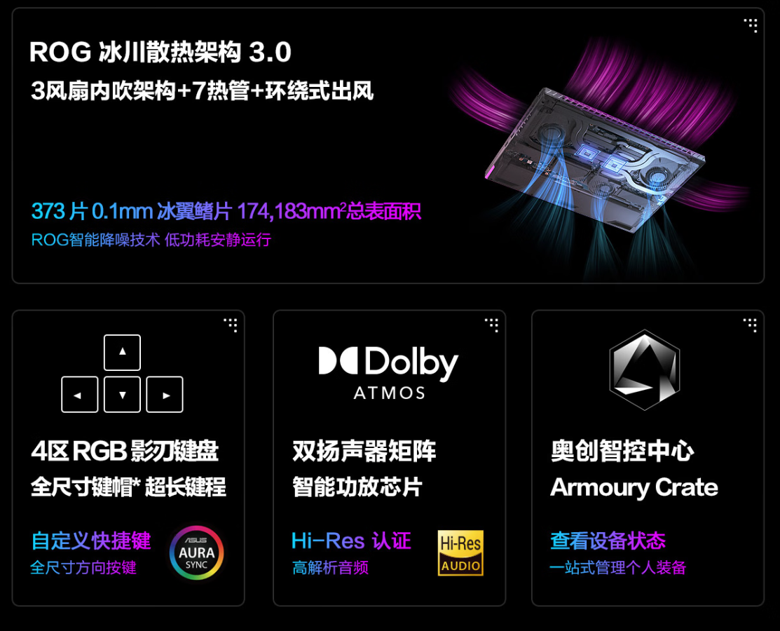 ROG魔霸新锐2025锐龙版采用冰川散热架构3.0,拥有3风扇以及7热管的豪华散热配置,配合独特的内吹式散热技术,可以实现高效散热,长时间高性能运行依旧稳定。