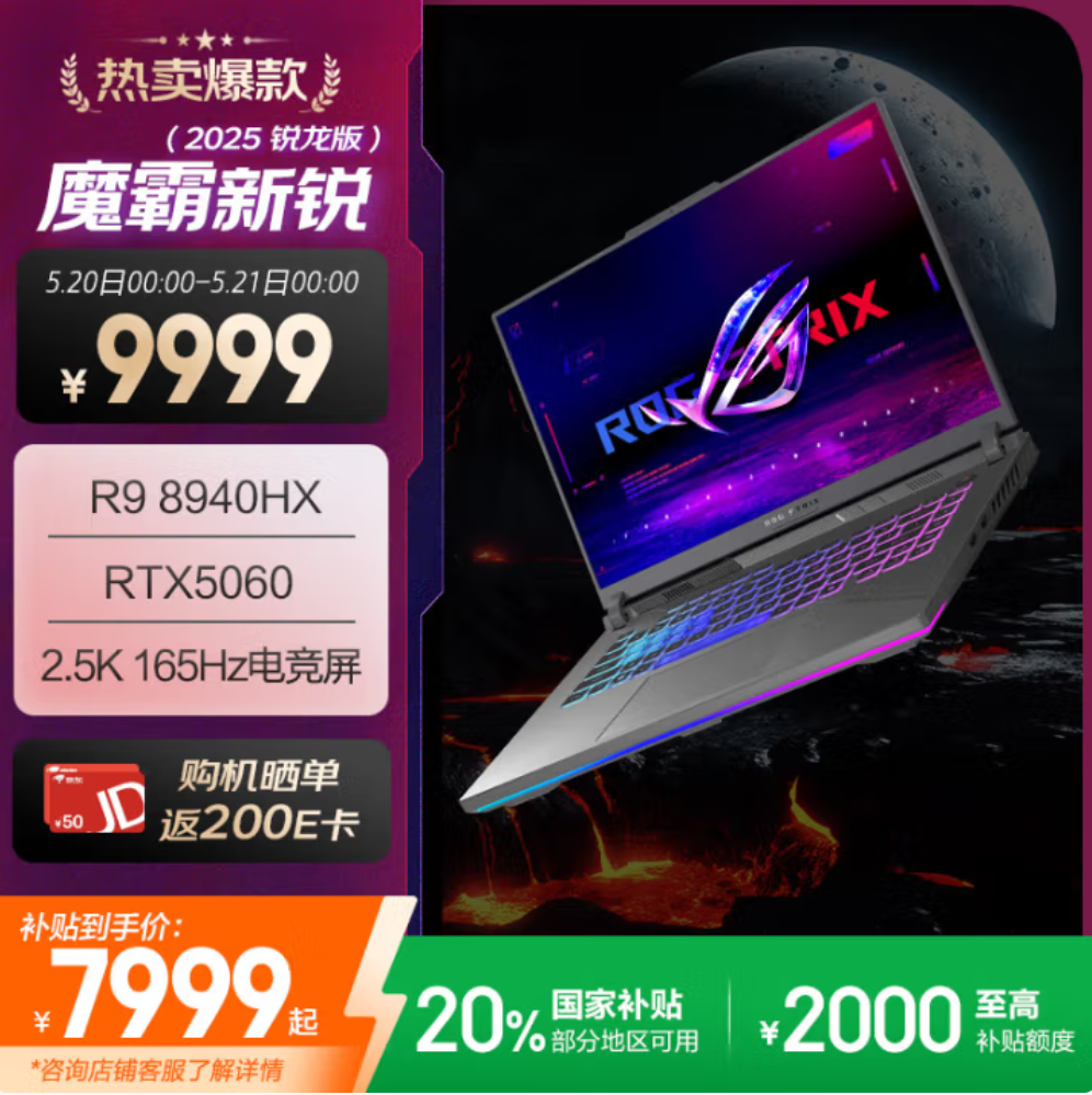 目前ROG魔霸新锐2025锐龙版正在预约中,售价9999元,可享受20%国家补贴,到手价低至7999元,同时晒单还返200E卡,实际到手仅需7799元。