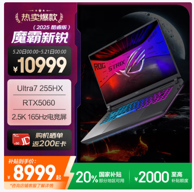 ROG魔霸新锐2025酷睿版售价10999元,国补到手价8999元,晒单返200E卡,到手价低至8799元,也是非常值得推荐的。