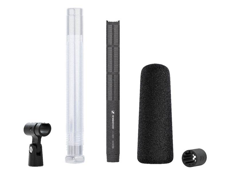 MKH 8018射频电容式立体声枪式麦克风包装内随附(由左至右)一个MZQ 100麦克风夹、一个螺纹塑料收纳筒、一个MZW 8018泡沫防风罩,以及MZR 8000摄像机适配器,用于将MKH 8018稳固安装在更大尺寸的麦克风夹或摄像机支架上
