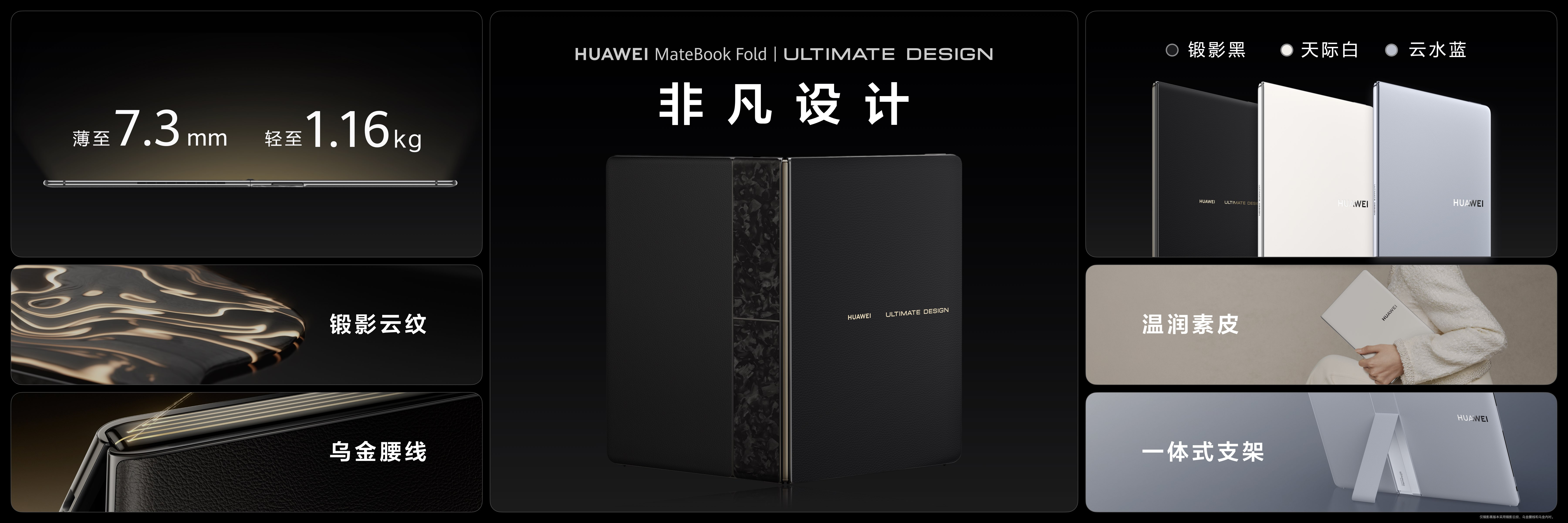 HUAWEI MateBook Fold非凡大师通过业界领先的折叠屏技术和轻量化工艺,打造目前全球最大商用18英寸折叠电脑,展开时仅7.3mm,重量仅1.16kg,整机折叠后小于13英寸,可轻松装入随行商务提包,带来笔记本电脑超便携体验。除了便携的机身,HUAWEI MateBook Fold 非凡大师更是带来18英寸沉浸式大屏,并通过3.3K高分辨率、1600nits峰值亮度等,为用户带来更真实、清晰、观感舒适的折叠屏视觉巅峰体验。