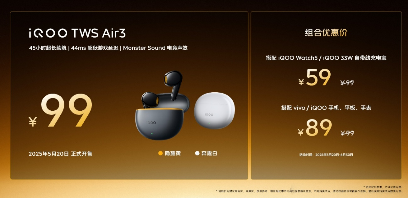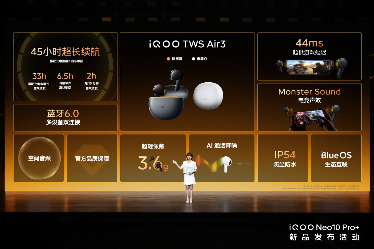 iQOO TWS Air3 具有“隐耀黄”和“奔霆白”两款配色,3.6g 单耳机佩戴轻盈舒适,支持 IP54更能安心使用;支持 LC3 音频编码,可实现全链路游戏 44ms 和耳机端 15ms 的低延迟;耳机单次听歌可达 10 小时,单次游戏可玩 6.5 小时,配合耳机盒可长达 45 小时听歌续航,而充电 10 分钟,就可连手机畅玩游戏2 小时,真正做到充得快、玩得久;拥有 12mm 高解析复合声音单元,具备空间音频、Monster Sound 电竞声效和 DeepX 3.0 立体声效,无论听歌还是玩游戏,都能带来更好聆听声效;支持蓝牙 6.0 多设备双连接和无线 K 歌耳返,并融入 BlueOS 生态,与生态内设备实现智联互通,是 vivo / iQOO 手机的好拍档。