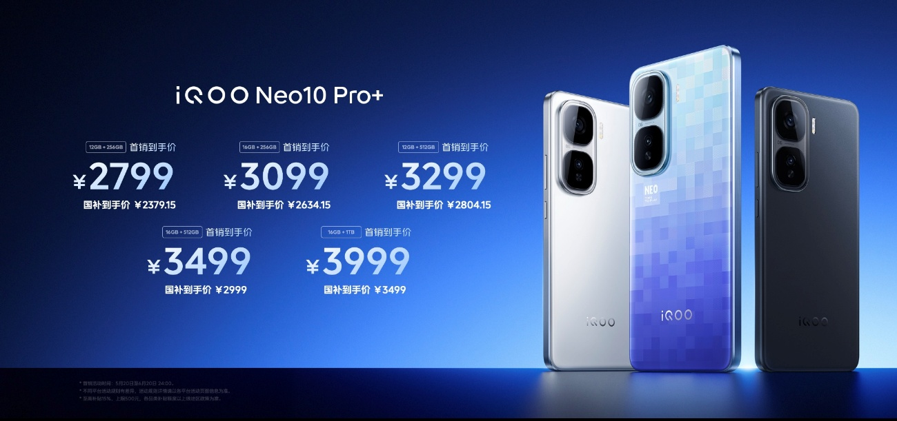 iQOO Neo10 Pro+ 共有“超级像素”、“驰光白”和“疾影黑”三种配色可选,提供 12GB+256GB、12GB+512GB、16GB+256GB、16GB+512GB 和 16GB+1TB 五种存储组合可选,到手价 2799 元起。
