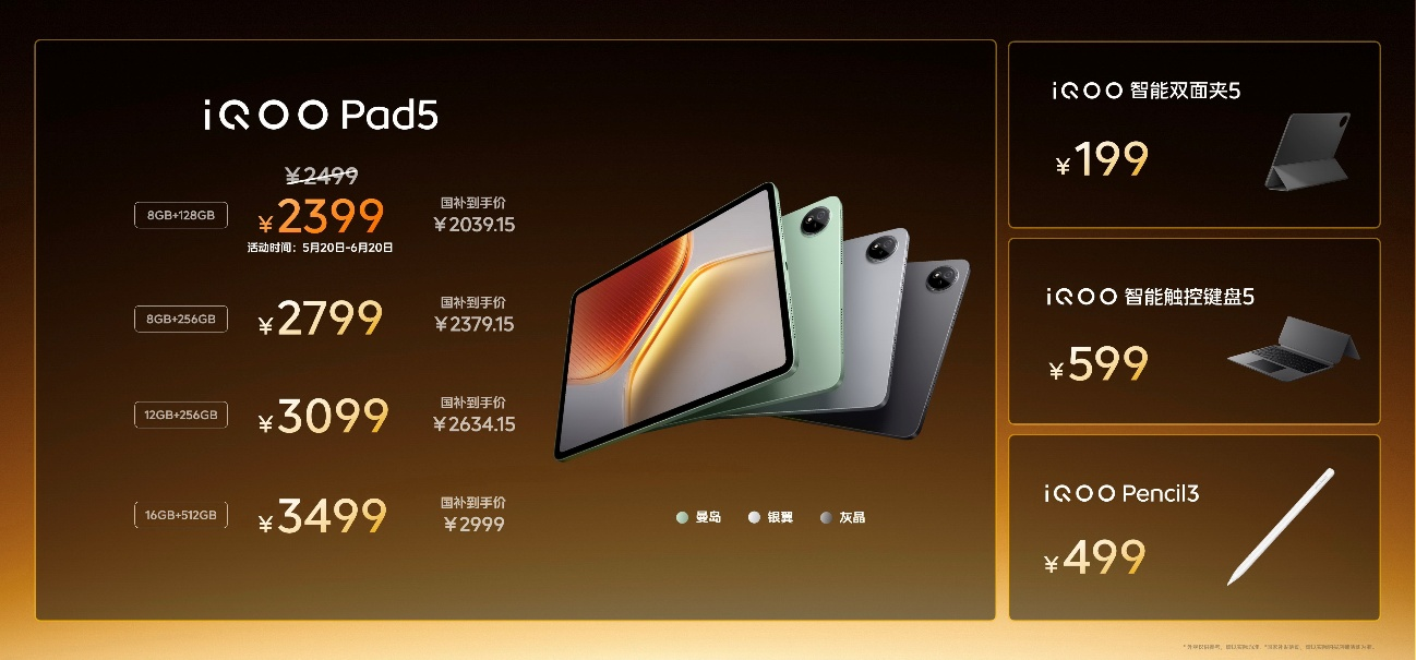 iQOO Pad5 系列共有“曼岛”、“灰晶”和“银翼”三种配色可选,iQOO Pad5 Pro 提供 8GB+256GB、12GB+256GB、12GB+512GB 和 16GB+512GB 四种存储组合可选,到手价 3199 元起,iQOO Pad5 提供 8GB+128GB、8GB+256GB、12GB+256GB 和 16GB+512GB 四种存储组合可选,到手价 2399 元起;iQOO WATCH 5 到手价 799 元起;iQOO 磁吸散热背夹 Pro、iQOO TWS Air3和 iQOO 33W 自带线充电宝到手价分别是 199 元起、99 元起和 129 元起。各款 IoT 设备搭配 iQOO Neo10 Pro+ 组合购买还能享受更多优惠。