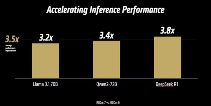 性能提升:ROCm 7 在性能方面实现了大幅跃升,其推理能力相比上一代 ROCm 6 提升超过 3.5 倍,训练性能提升达到 3 倍。这一成果得益于在易用性、性能优化以及对 FP4、FP6 等低精度数据类型支持方面的改进。同时,通信栈的进一步增强也优化了 GPU 利用率和数据传输效率。