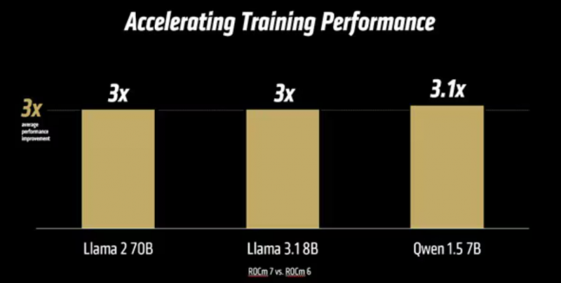 图 2 显示在 AI 训练中,ROCm 7 相较于 ROCm 6 平均实现了 3 倍的性能提升²。
