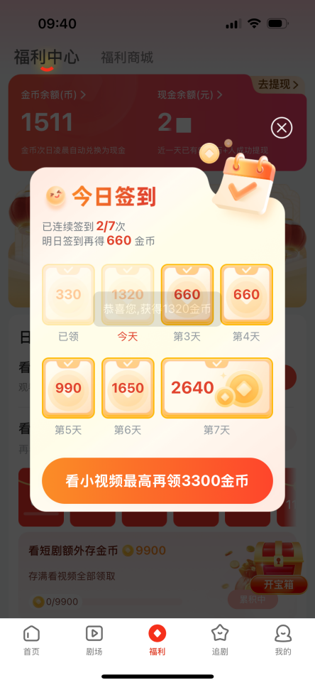 1.短剧新人宠爱福利:勤打卡爆金币