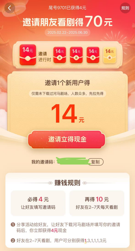 追剧时哪能少了追剧搭子的陪伴?把河马剧场邀请码丢进家人群,不仅可以和搭子们一起磕糖吐槽,还可以一起领福利:好友通过你的邀请码注册,同时连续6天看短剧,你就能拿到拉新现金奖励,躺赢!