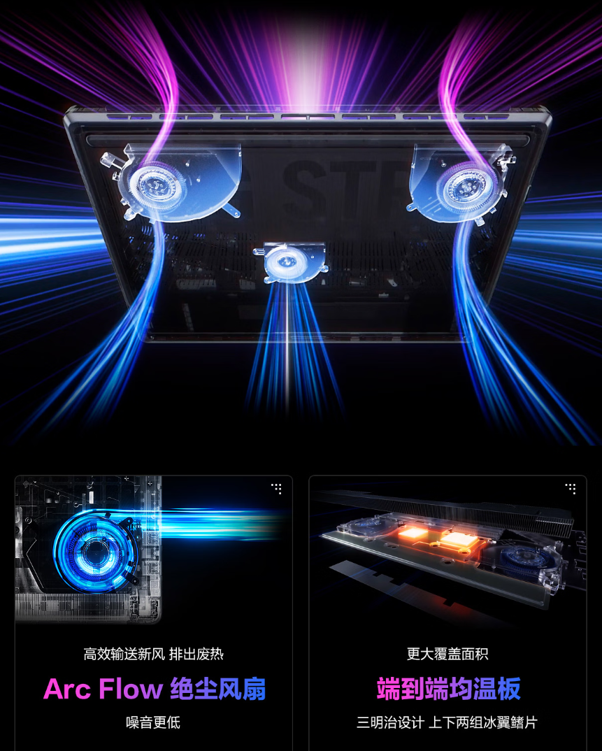 为了实现高效的散热,ROG魔霸新锐2025配备了冰川散热架构3.0增强版,通过CPU处的2代液金以及超大均温板实现核心部件的快速降温,再加上内吹三风扇以及全后侧贯穿式出风,进一步加速了降温效率。