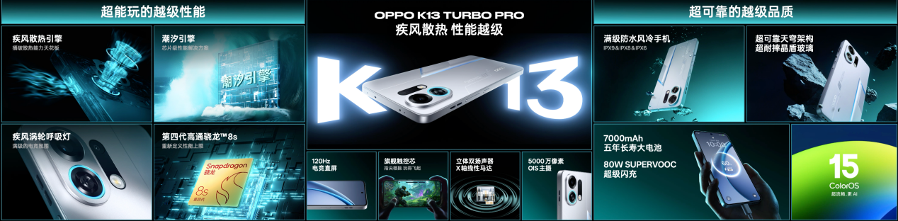 2025年7月21日,东莞——OPPO今日正式发布越级性能先锋 K13 Turbo 系列,全新K13 Turbo系列包括升级版K13 Turbo Pro和标准版K13 Turbo两款产品。K13 Turbo系列搭载OPPO自研疾风散热引擎,以风量大、体积小、能防水、超低功耗等优势,打破手机散热能力天花板,为用户带来前所未见的越级性能体验。全新K13 Turbo Pro配备第四代骁龙8s和OPPO潮汐引擎的性能组合,以及7000 mAh超大冰川电池和 80W 超级闪充的续航组合,长久释放高效性能。新增高能户外模式2.0功能,联动疾风散热引擎的主动散热能力,全面优化在高温、弱网环境下的使用体验。针对玩家普遍关注的高能游戏场景,K13 Turbo系列除了提供强劲散热能力外,全新游戏相机还提供“实况截屏”、“一键回录”、“静音启动按键”等体验,尽享畅快激情。