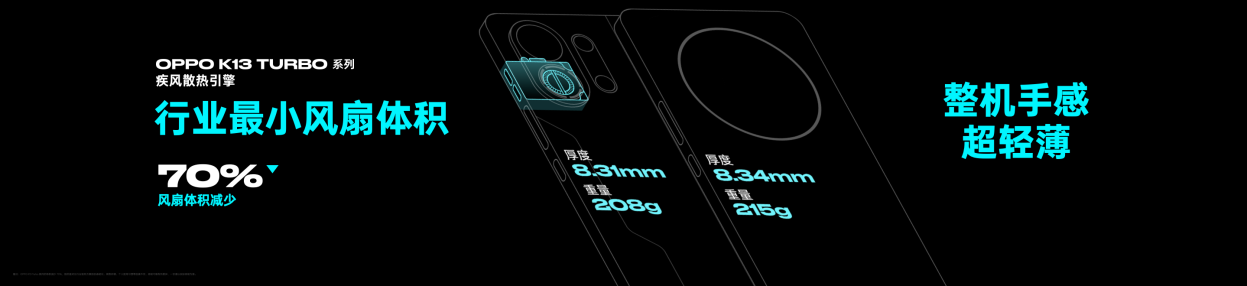 为了解决内置风扇模组带来的机身厚度问题,K13 Turbo 系列延续OPPO在精工设计方面的技术优势,将疾风散热引擎模组高度集成,对比传统方案体积缩小70%,释放更多空间供其他模块堆叠,堪称模组设计新标杆。同时,疾风散热引擎还首创潜水泵设计、超精密焊接工艺等方式,在集成散热风扇的手机中,打造出行业唯一的IPX9 & IPX8 & IPX6 满级防水体验。