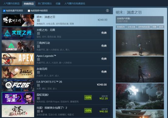 IT168游戏网消息,在《黑神话:悟空》取得成功之后,另一款国产3A大作《明末:渊虚之羽》于7月22日跃居Steam热销榜榜首。这款游戏的定价为248元,而豪华版则标价298元,计划于7月24日全面发售。相比之下,《黑神话:悟空》的基础版售价略高,为268元。