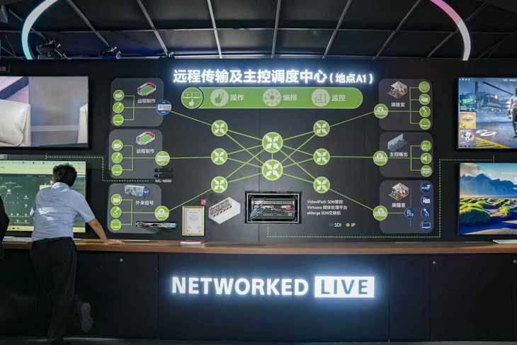 该展区围绕Networked Live的核心理念,通过电竞直播、演唱会直播和电影制作三大应用场景,全面展示远程传输和主控调度中心的解决方案。该展区不仅呈现远程传输的工作场景,更展现了Networked Live网络化制播全流程解决方案中核心的主控调度工作模式。重点突出系统核心调度、信号路由和网络管控等关键环节。展区集中展示了网络化制播全流程解决方案中的核心产品和技术,包括VideoIPath SDN管控系统、Virtuoso媒体处理平台和eMerge SDN专用交换机以及HEVC板卡和功能的创新应用。