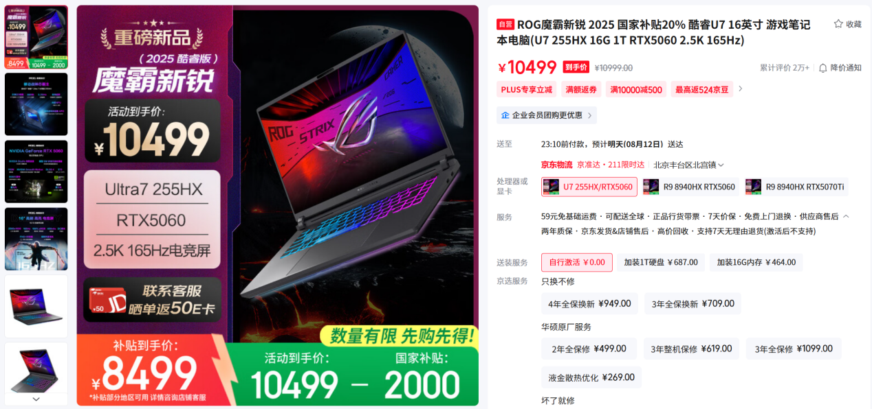 ROG魔霸新锐2025售价10499元,国补至高2000元,到手价8499元,同时还可参与购机晒单返50E卡的活动,想要入手的用户不要错过。