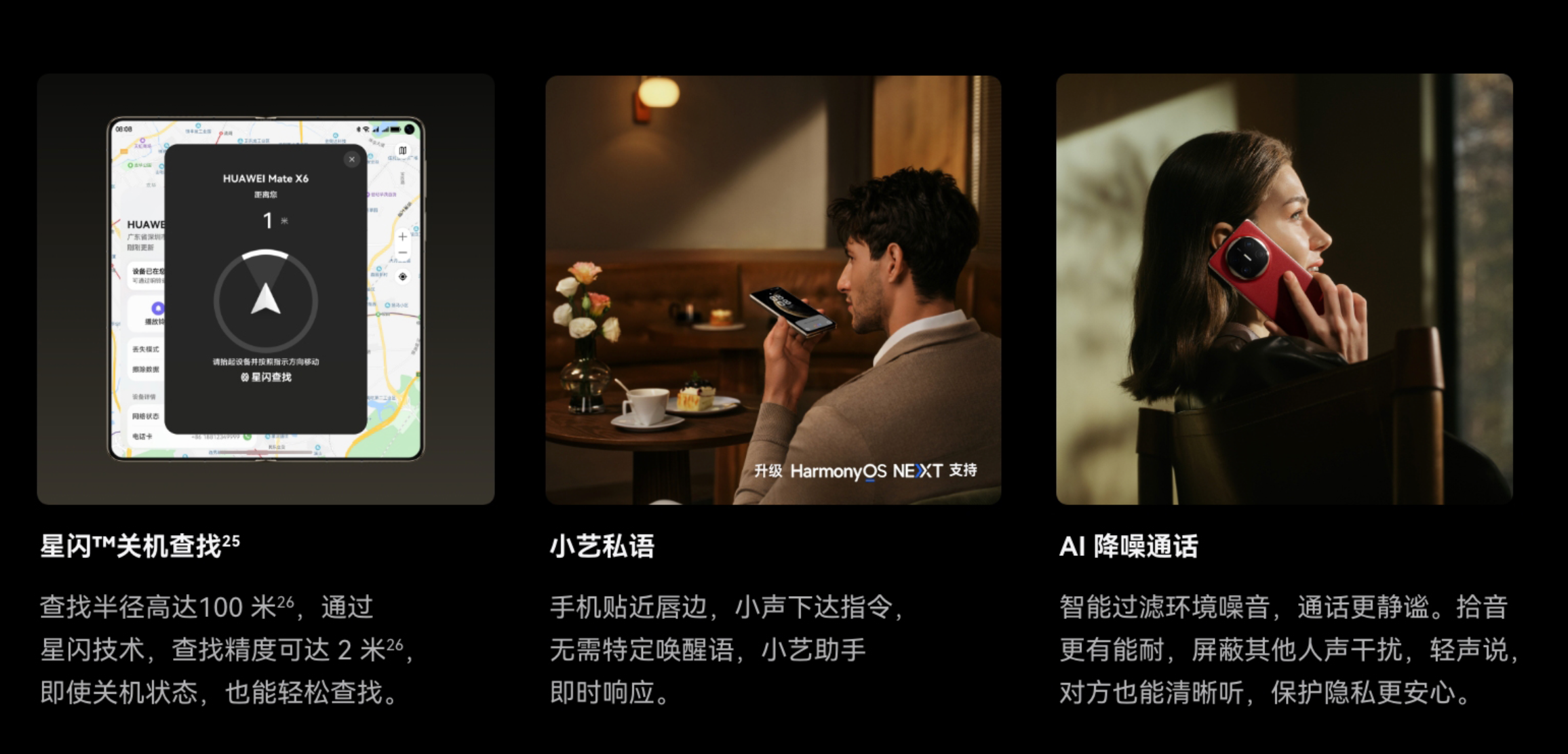 而说到鸿蒙AI,华为Mate X6在升级到鸿蒙操作系统 5之后,体验也强得飞起,新增了小艺私语、声音克隆、AI消息随身等功能。其中,小艺私语在开启后,用户即使对其小声说话,小艺也能精准识别,能够像说悄悄话一样,既保护隐私,又不打扰旁人;声音克隆能让小艺模仿用户声音,成为专属的个性化智能助手;而AI消息随身则能在检测到有其他人观看屏幕时,将推送消息流转到用户的华为手表等其他设备,兼顾隐私性和便利性。