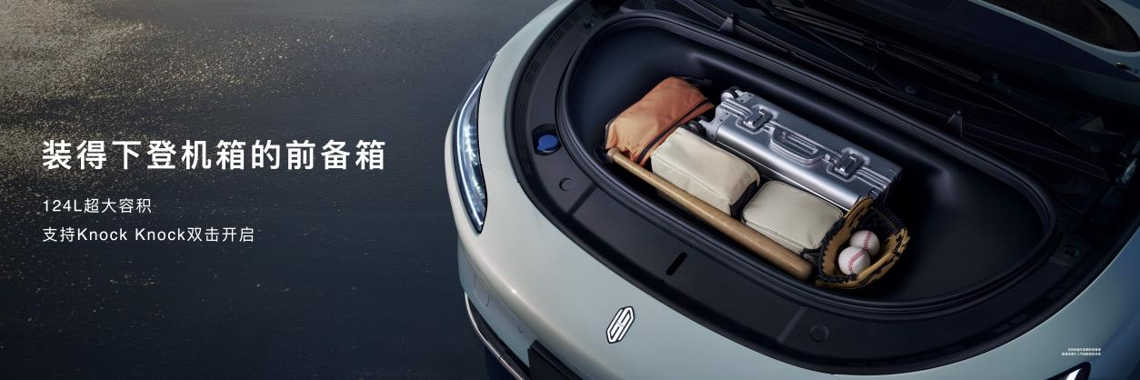 纯电版车型有124L超大容积前备箱,装得下登机箱,符合用户使用习惯,支持Knock-Knock双击开启,让用户拿取更轻松。