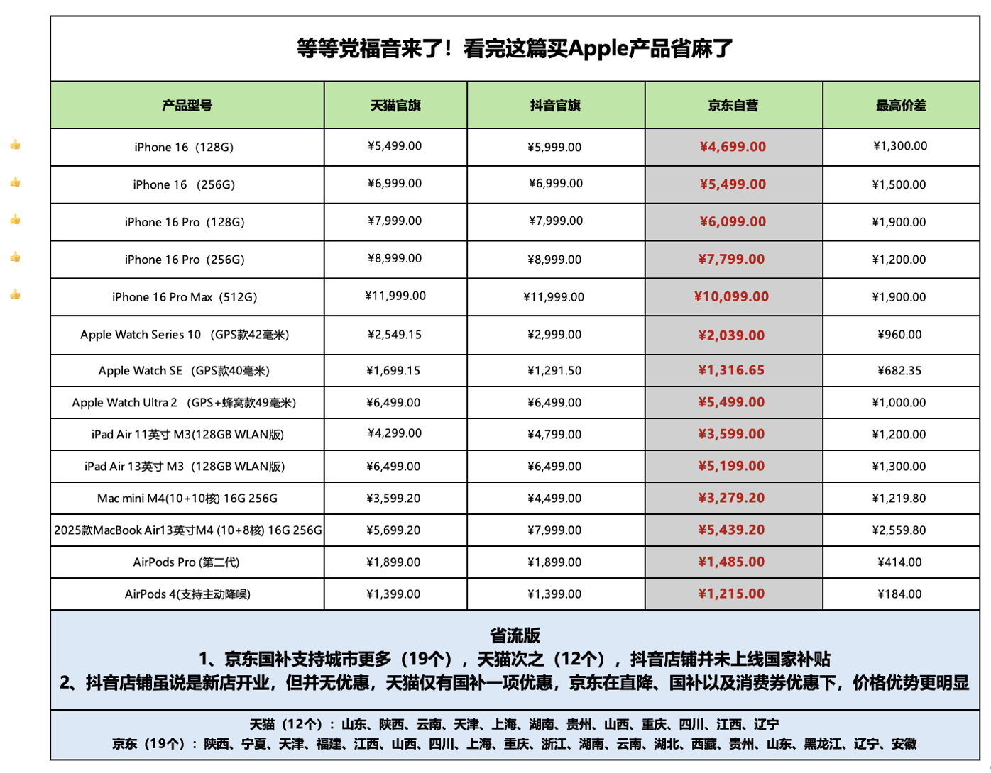 在国补上线省市方面来说,虽说3C产品的国补范围持续缩减,目前京东覆盖19个地区,天猫仅剩12个地区,而抖音店铺未上线国补。这意味着,即使机型相同、价格一致,消费者仍需确认所在地区是否在补贴范围内。总体来看,京东的覆盖范围更广,果粉可以优先关注。